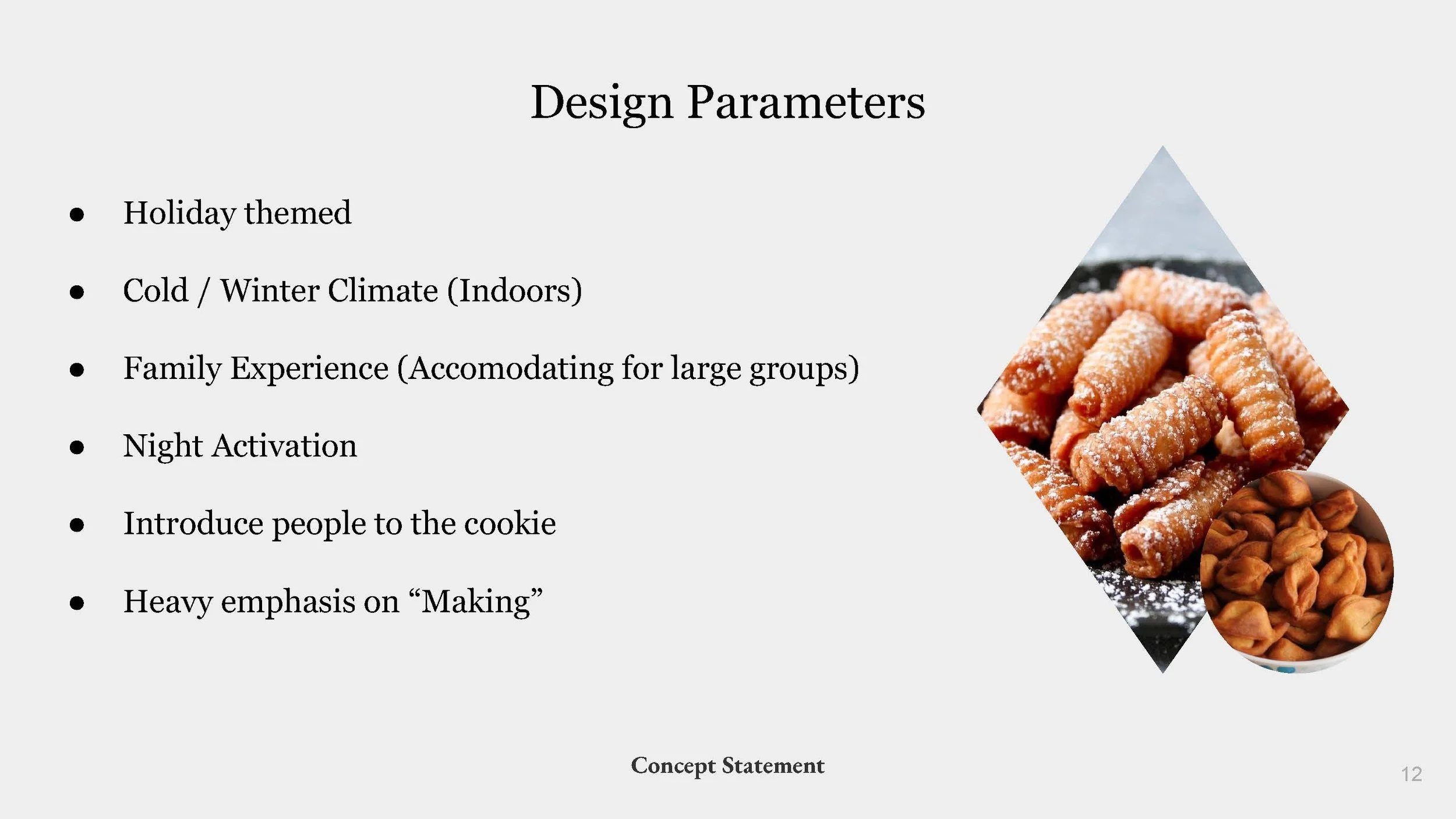 The experience is narrated by an anthropomorphized family of kul kuls that teach visitors all about the sweet. This experience would run through the holiday season and offer guests family bonding time, a sense of accomplishment, and a sweet reward. The audience will be families and groups of all ages and sizes looking for a novelty holiday activity. The experience would last approximately 90 minutes.